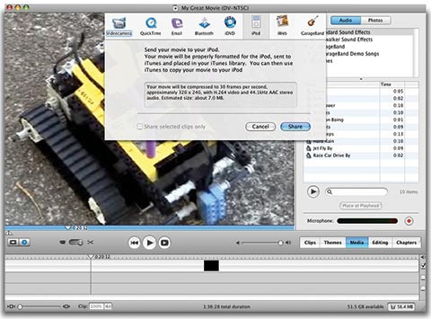 If you're using the previous version of iMovie HD (from iLife '05), you need to create a custom preset for the exported file. (The built-in preset has a bug that makes exported movies appear stretched on the iPod's screen.) Go to File: Share, click on the QuickTime tab, and choose Expert Settings from the Compress Movie For pull-down menu. Click on the Share button. In the Save Exported File As dialog box, click on Options. Choose Use Custom Size from the Size menu and type 320 and 240 in the Width and Height fields, respectively. When you click on the Save button, iMovie will export an iPod-compatible version of your movie. Then you can watch your own-made movie on your video iPod.