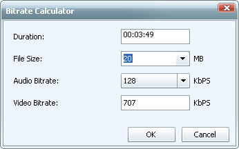 Click "Tools > Bitrate Calculator" option, then "Bitrate Calculator" dialog pops up. Enter the size you want in the "File Size" textbox, and choose desired audio bit rate, then the video bit rate will be calculated promptly. Click "OK", then the entered size will be displayed in the "Output Size" column of the file list, and the bit rate will be changed in the "Advanced Profile Settings" panel.