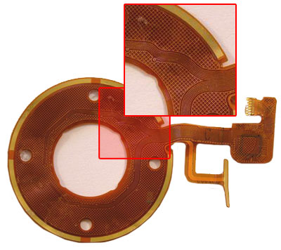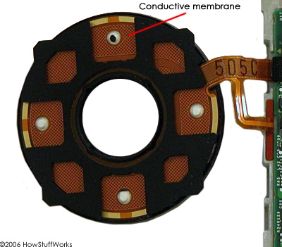 Under the plastic cover of the iPod Click Wheel, there is a membrane embedded with metallic channels. Where the channels intersect, a positional address is created, like coordinates on a graph.