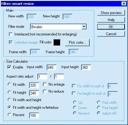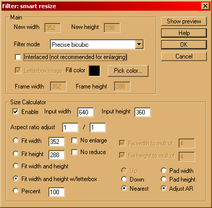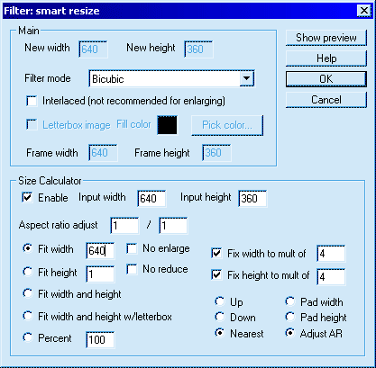The easiest and best settings are the ones I've shown in the picture. Your input width and height will be different from mine, but everything else should match. The Filter mode selects the quality. Precise Bicubic is the best and slowest. Probably all of them are fine except for the first one: nearest neighbor (that is what the built-in virtual dub filter does). If you follow all the settings above, you won't have to worry about multiples of 4 or anything else related to size. This will (should) just work :).
