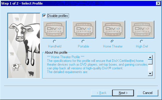 The first thing you need to do is to configure DivX to create Archos-compatible video. To do this, click the "Select Profile Wizard". On the first screen, checkmark the "Disable profiles" checkbox like this: