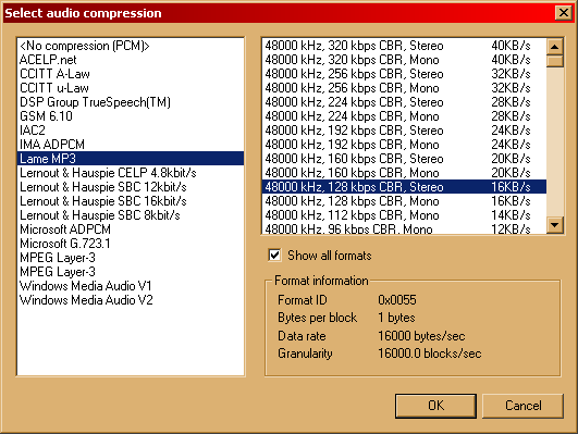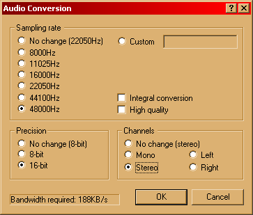 You should now see the dialog box pictured below. The key things are: make sure you convert to the same Stereo/Mono and kHz that you selected when we setup the MP3 encoder. Also, always select to convert to 16bit.