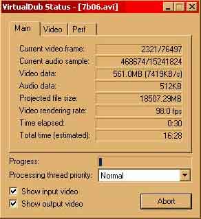 • Click on Start, and VDub will go off and process the two, and you'll end up with the two files specified.