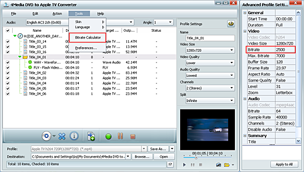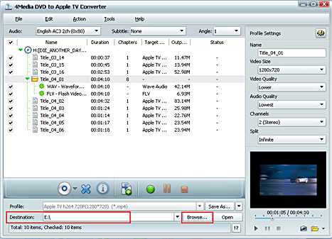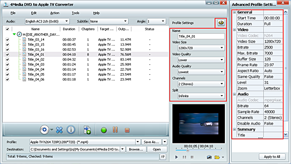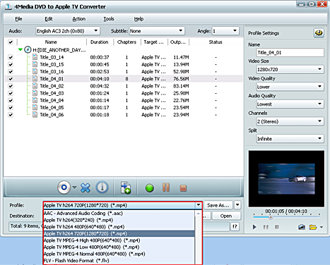 Compared with other DVD to Apple TV Converter software, 4Media DVD to Apple TV Converter has more settings you can customize, e.g. convert DVD to Apple TV mp4 video by custom file size through setting video bitrate, convert DVD's any segment, select target subtitle, move position of the subtitle, or select audio track. You can get adjustable quality on your television via Apple TV.